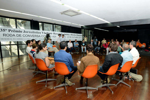 Na manhã de terça (22/10/13), pela segunda vez em sua história, o Prêmio promoveu uma Roda de Conversa entre seus vencedores. A troca de experiências entre os participantes se deu na Sala dos Espelhos, no Memorial da América Latina, e contou com transmissão pela internet feita pela TV PUC.